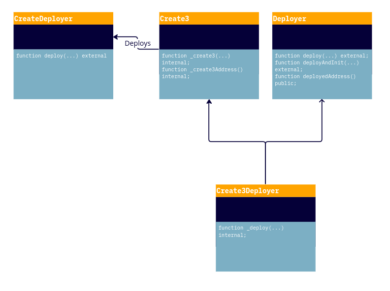 OK, so we have a generic Deployer which can get inherited from either this Create3Deployer, or presumably a Create2Deployer too (wen create4? 👀👀). Something like a template method pattern in OOP talk.